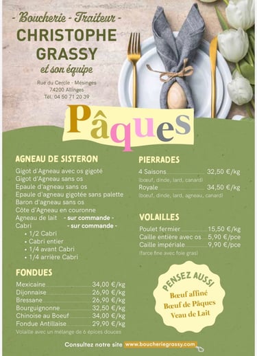 Pour célébrer Pâques comme il se doit, la Boucherie Grassy vous propose une sélection spéciale de viandes et préparations artisanales. Découvrez notre carte et préparez un repas d’exception